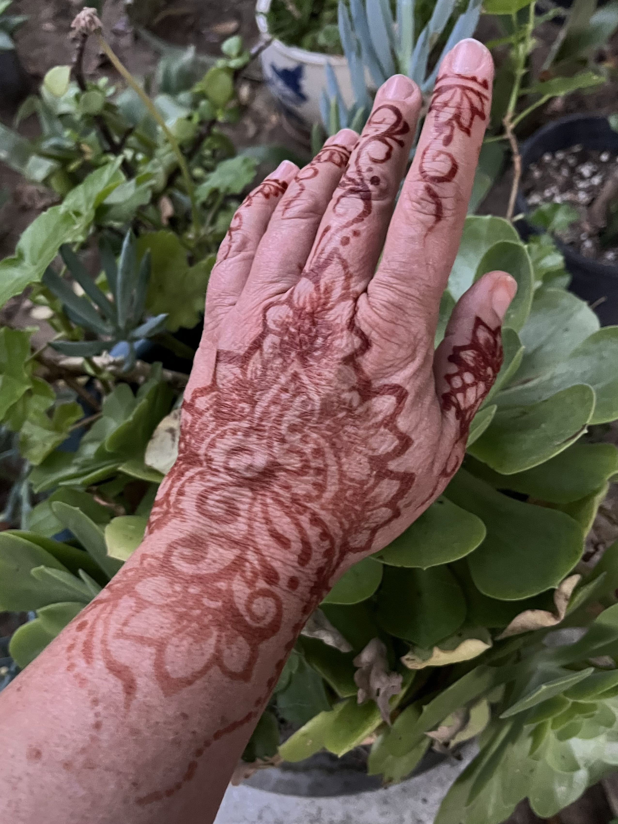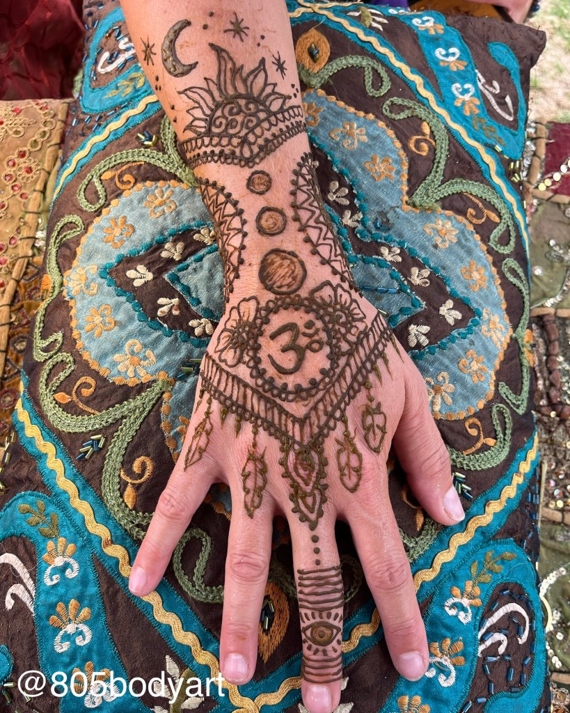 Each batch of henna is handmade by Andi before it is applied to your skin. Henna paste is an all natural plant based mixture made with care from the powdered leaves of the Persian shrub Lawsonia inermis (henna plant), essential oils, lemon juice and sugar.
